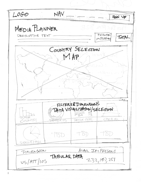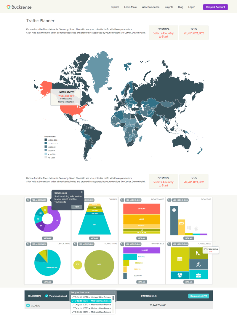 The Traffic Planner tool, shown below, exposes data from the back end API to allow users to create a real-time snapshot of global advertising inventory. Users can click on the interactive graphics to select campaign targeting parameters such as location, device type, carrier, device OS, banner size potential and more to explore the potential reach of their campaigns. These same filters can be used to create multi-dimension subgroupings as well.